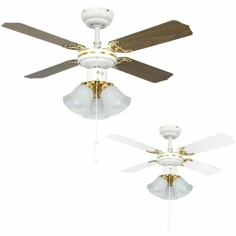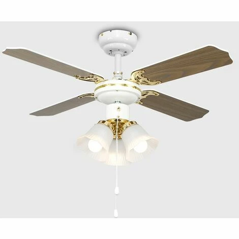 Modern MiniSun branded four blade three speed ceiling fan in a brass effect and white finish. Features reversible blades in white or oak effect finish. Includes an integrated three way ceiling light with frosted glass shades. Ideal for most rooms this ceiling fan has a directional motor so it can be used in both warm and cold conditions. Comes complete with full product guide and installation instructions. RPM on highest setting 230 RPM on medium setting 170 RPM on lowest setting 110.