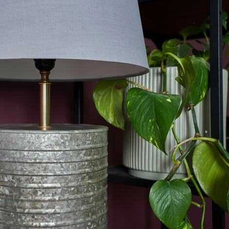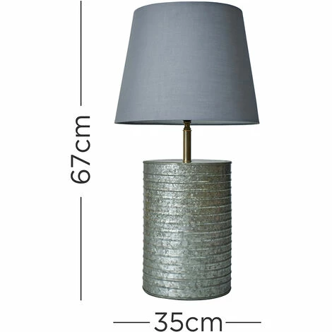 This MiniSun table lamp comes in a zinc coloured metal barrel finish. Complete with an in-Line on/off rocker switch for easy use and a large tapered lampshade. Ideal for living rooms bedrooms hallways dining rooms and other living areas.